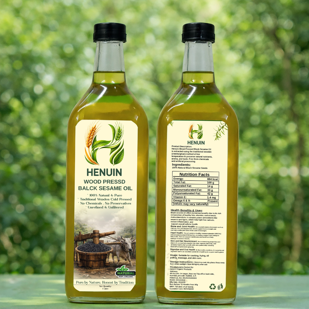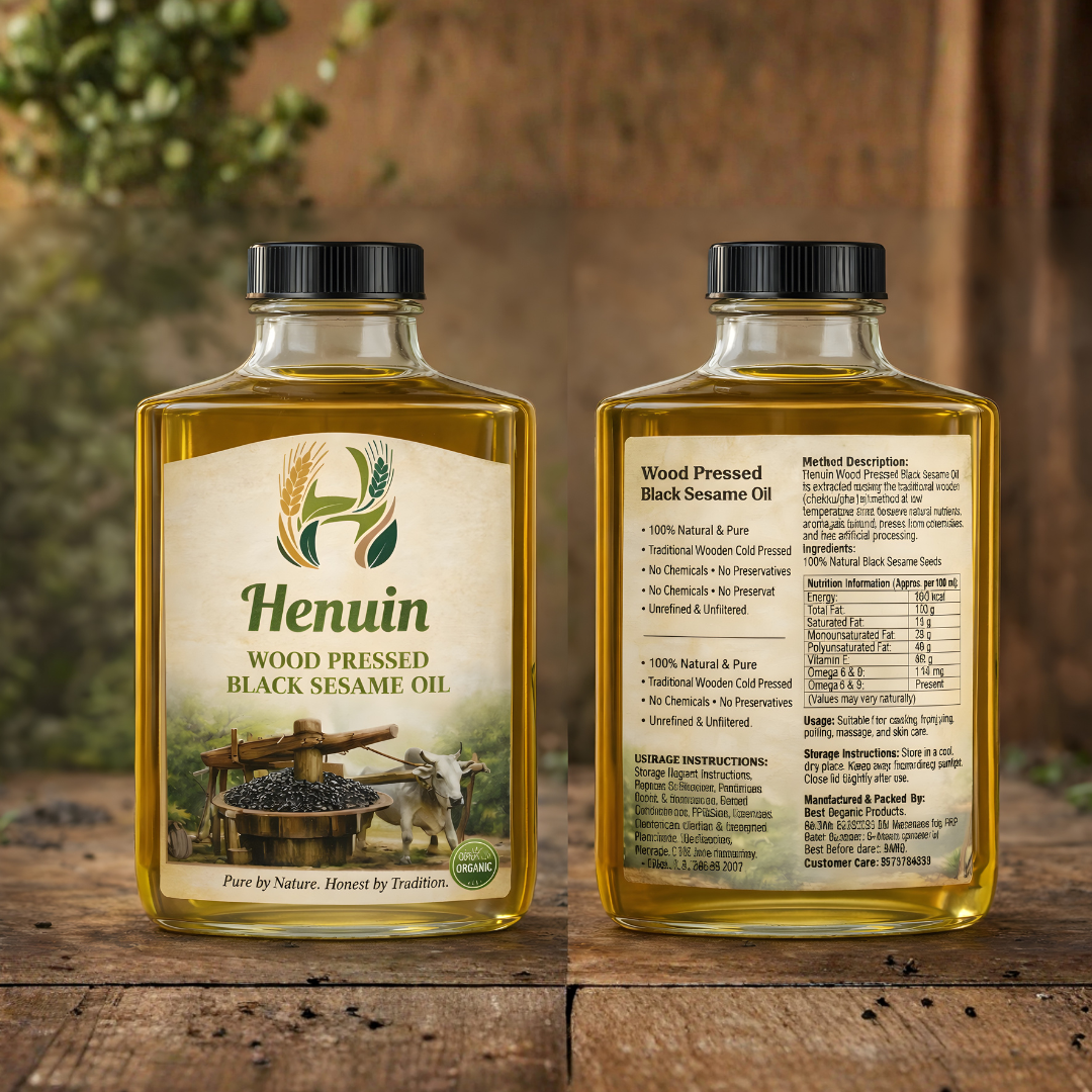 Henuin Wood Pressed Black Sesame Oil is traditionally extracted using the wooden chekku/ghan method at low temperatures to retain its natural nutrients, aroma, and taste. This oil is 100% natural, unrefined, and free from chemicals or preservatives, making it a wholesome choice for everyday cooking and wellness practices.